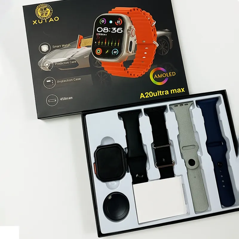 A20 Ultra Max AMOLED Smartwatch – 4 Strap Combo | SIM, Bluetooth Calling & Wireless Charging